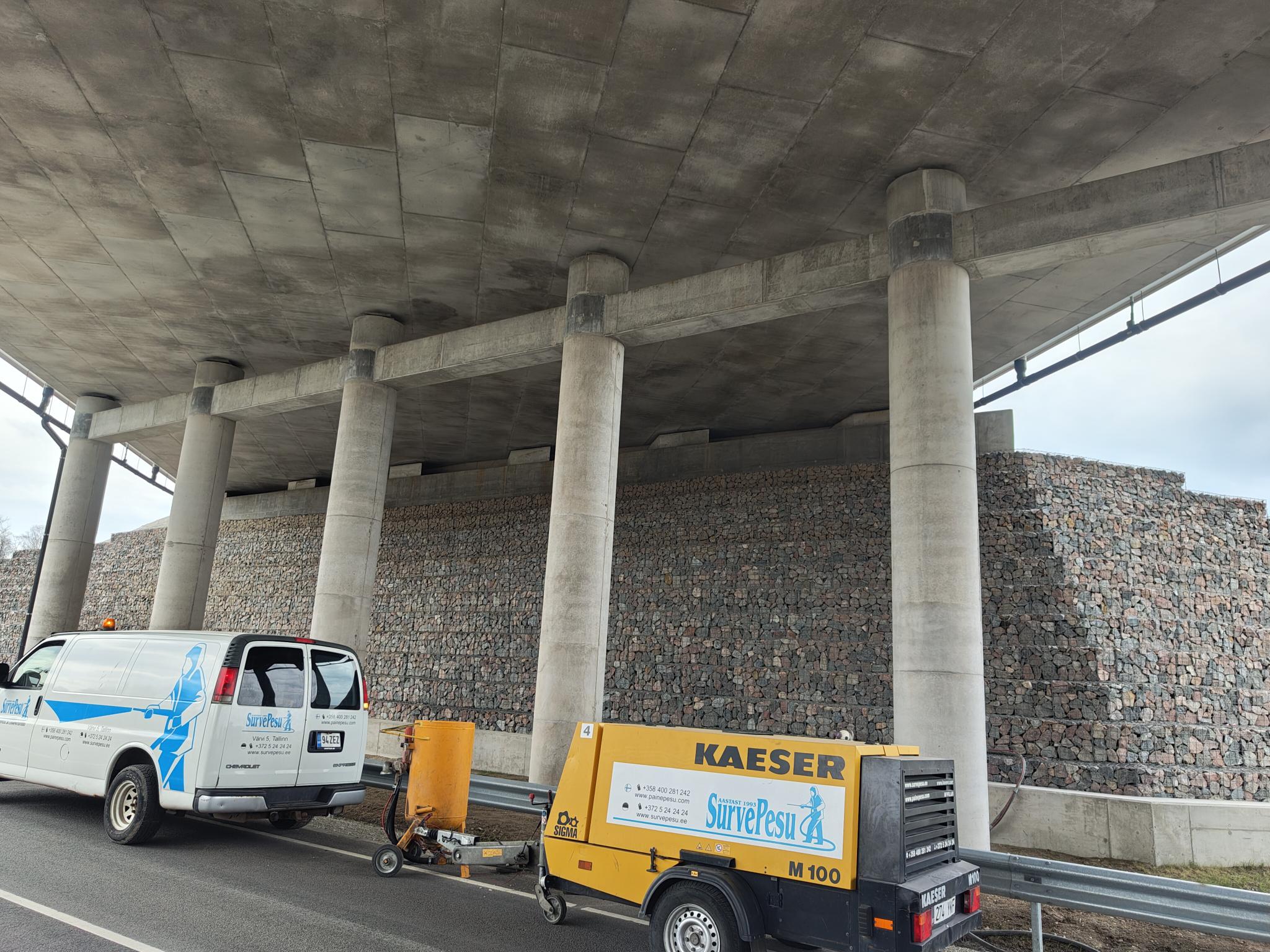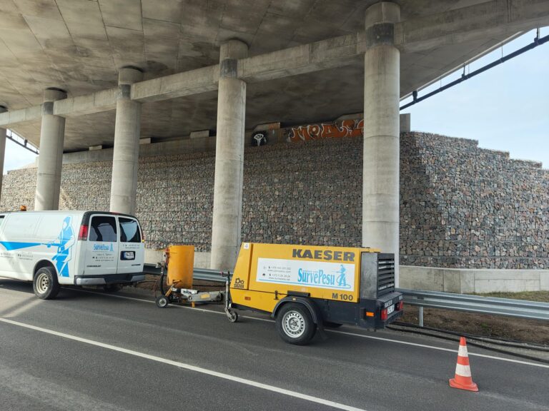 Grafiti eemaldamine kasutades kuumvesikõrsurvepesu meetodit koos grafitieemaldusainega ja kuivliivapritsiseadmeid koos abrasiiviga mikroklaas.