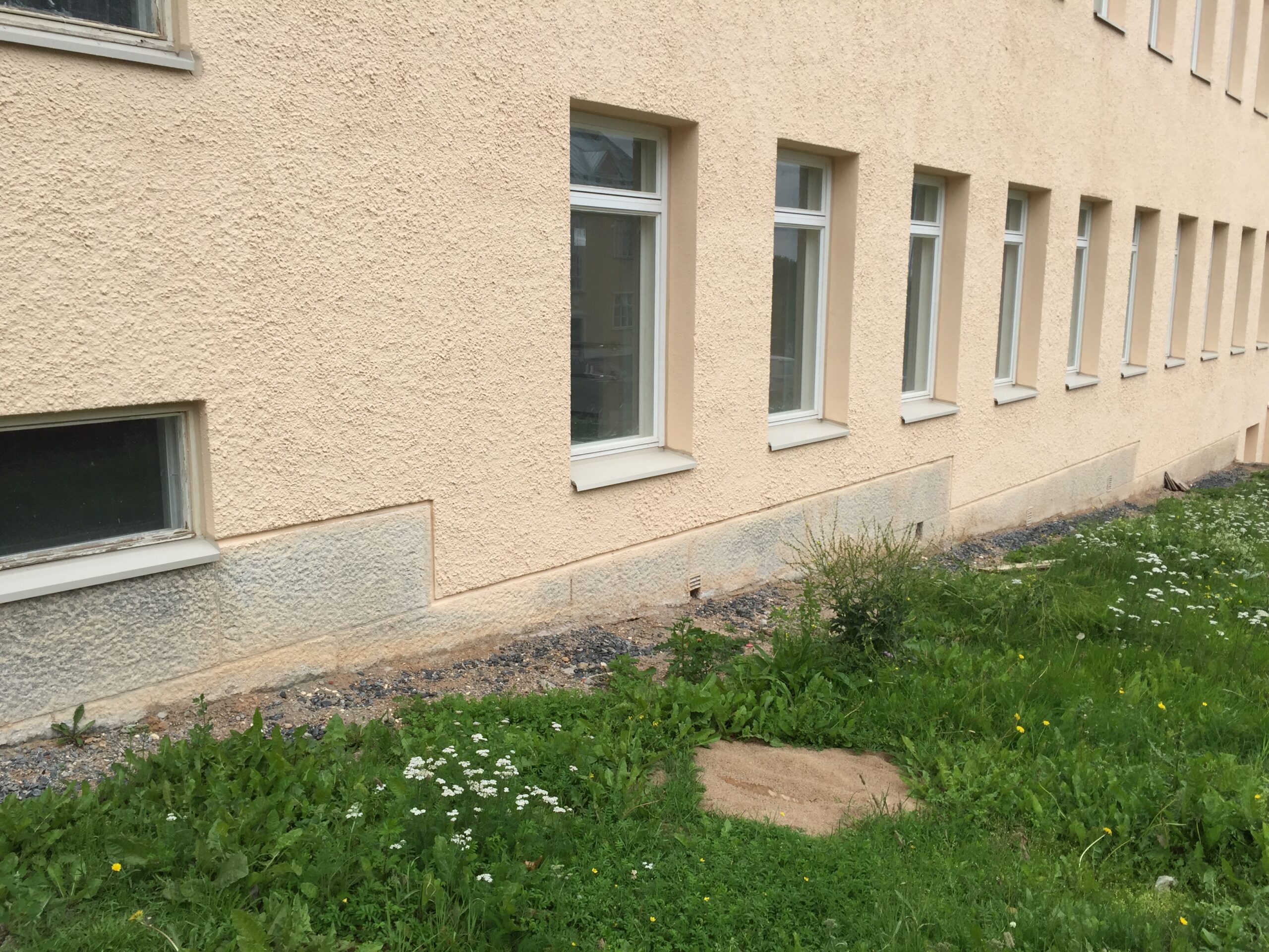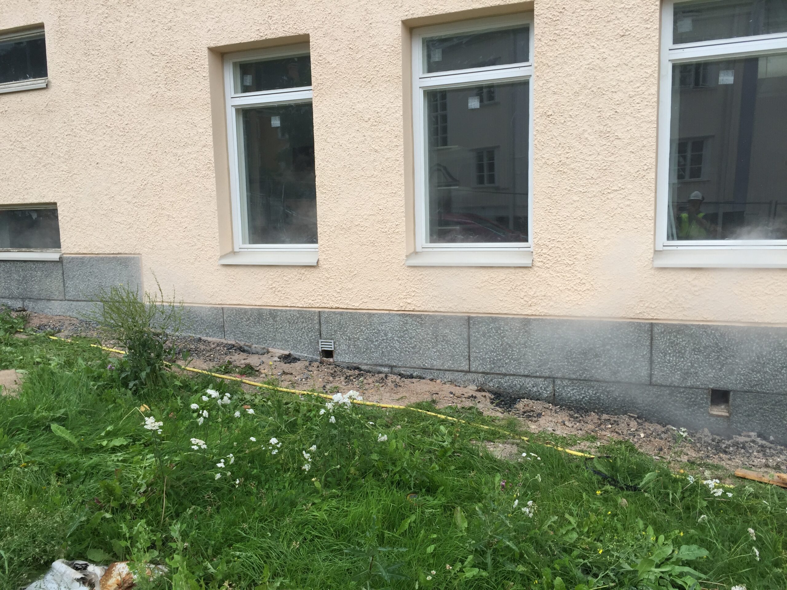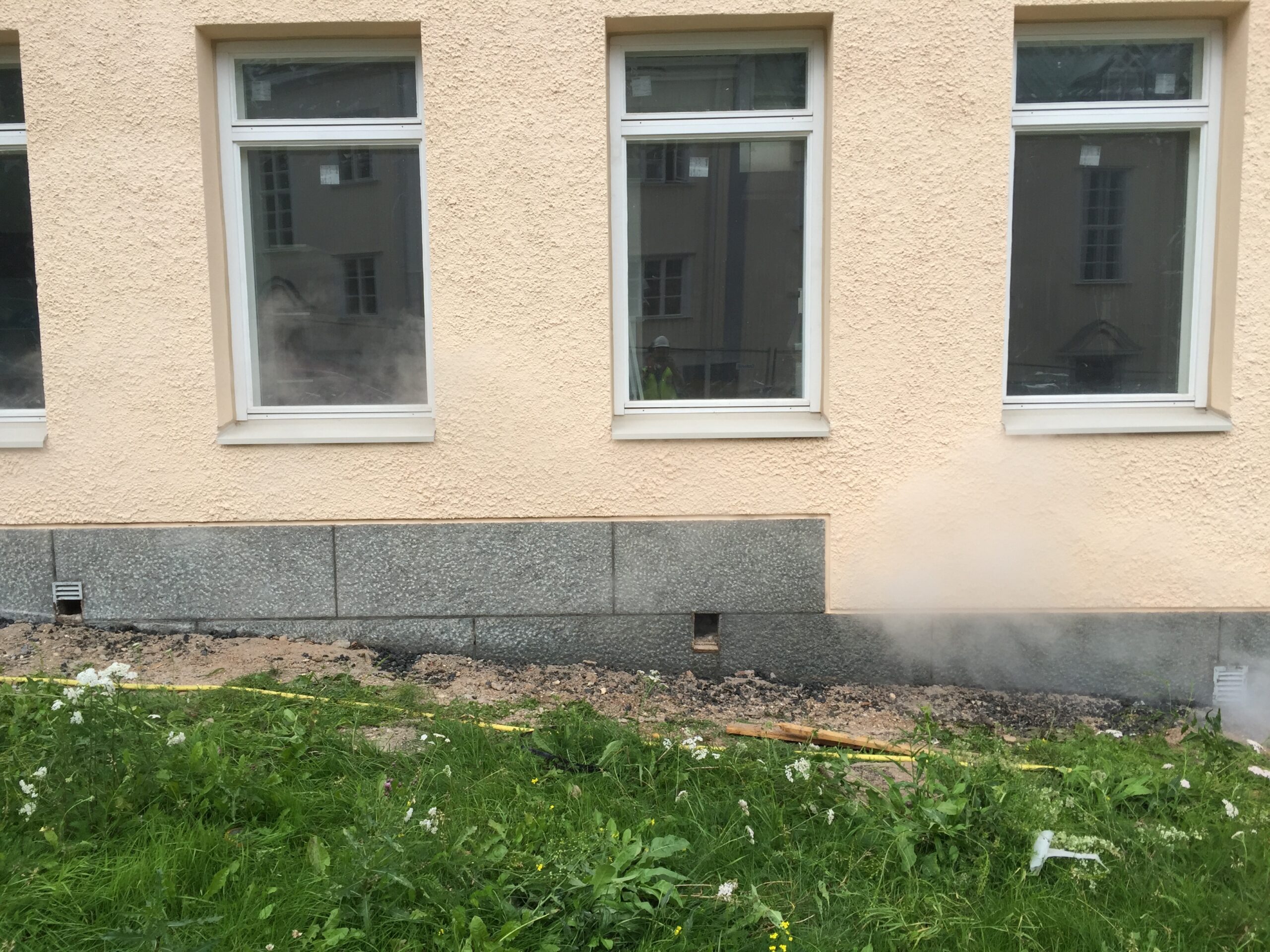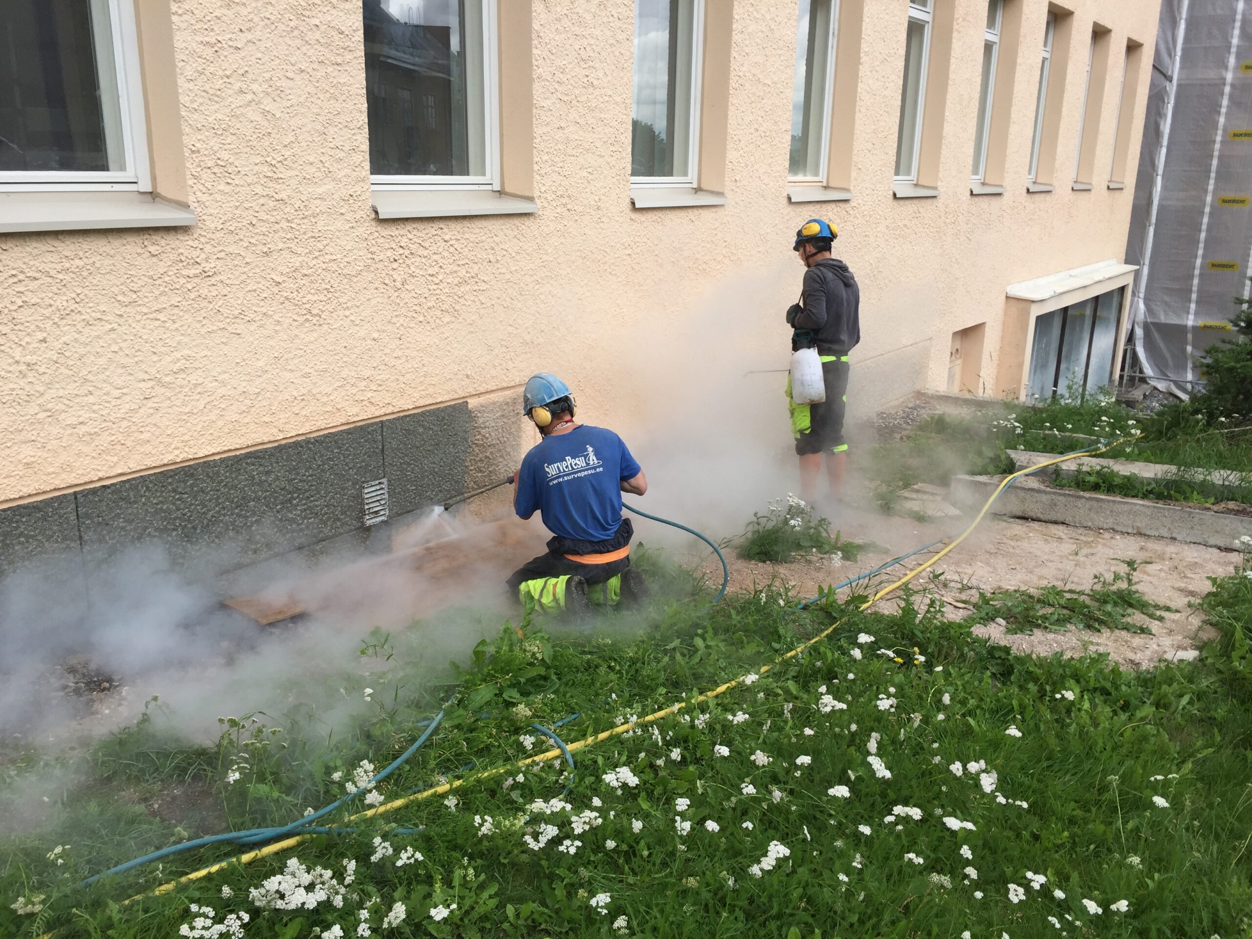 Graniitsokli puhastamine fassaadivärvist 500 BAR kuumvesikõrgsurvepesu meetodil.