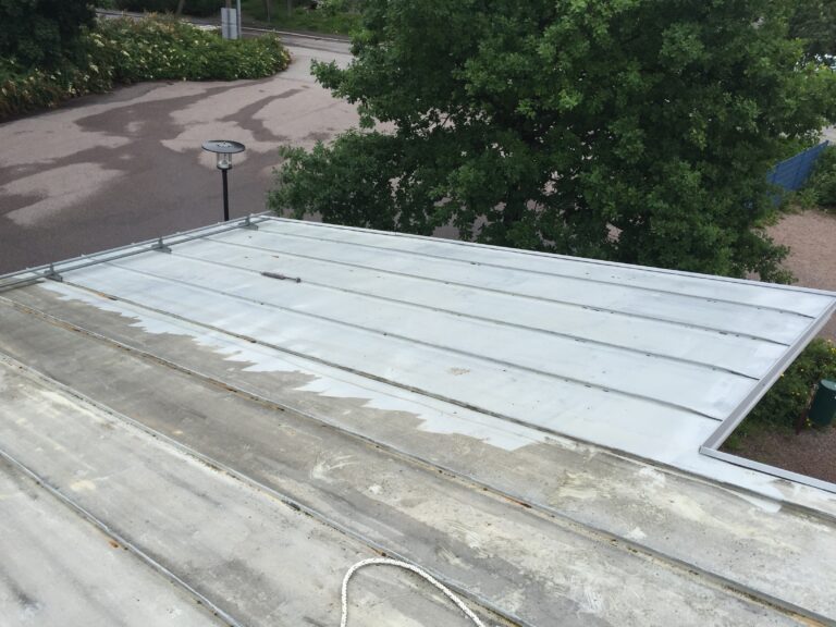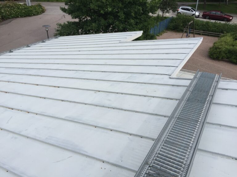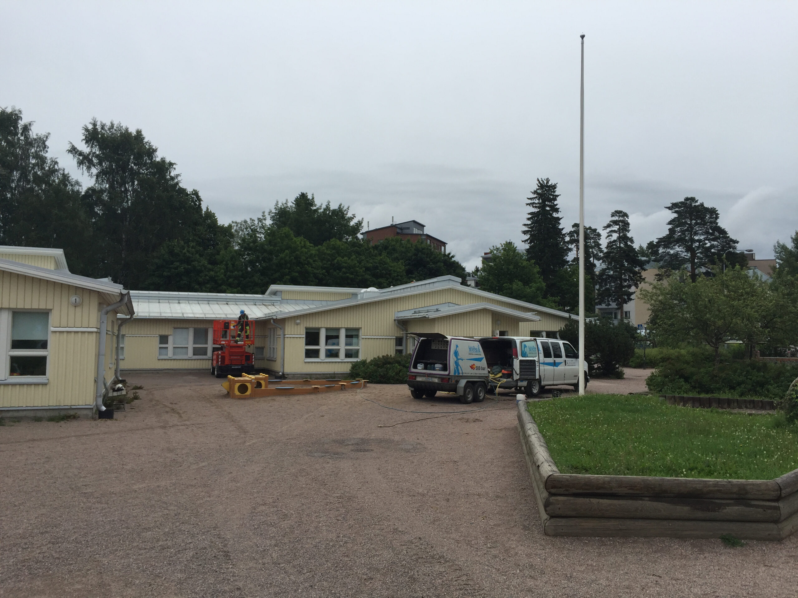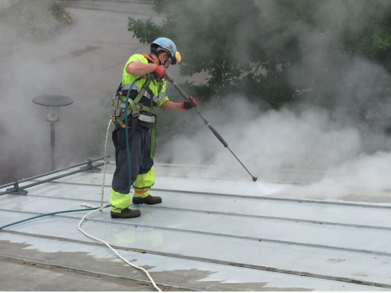 Jokiniemi lasteaia valtsplekkkatuse pesu 500 BAR kuumvesikõrgsurvega enne katuse värvimist.