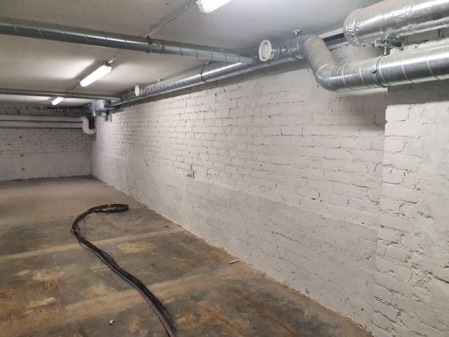 Maaaluse autogaraaži seina tellis – ja betoonpinna puhastamine värvist märgliivapritsi meetodil.